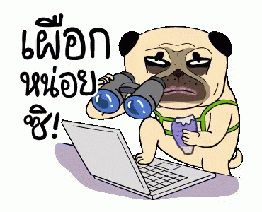 A cartoon pug dog intently looks through binoculars while sitting in front of an open laptop, with Thai text.