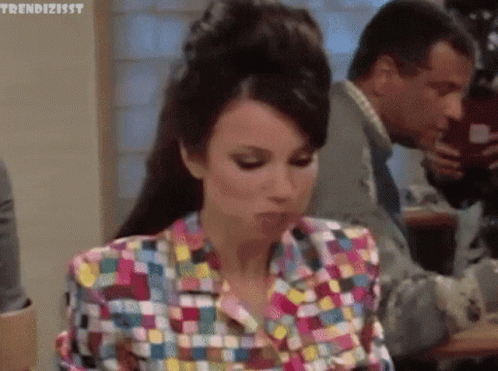 A woman in a colorful jacket makes an annoyed, wide-eyed expression, puffing out her cheeks.