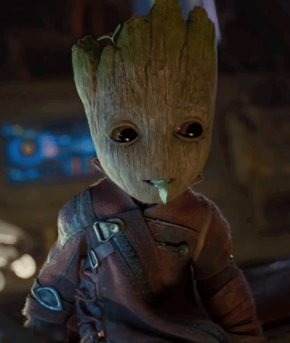 Baby Groot from Guardians of the Galaxy barfs a green substance, looking disgusted in this close-up scene.