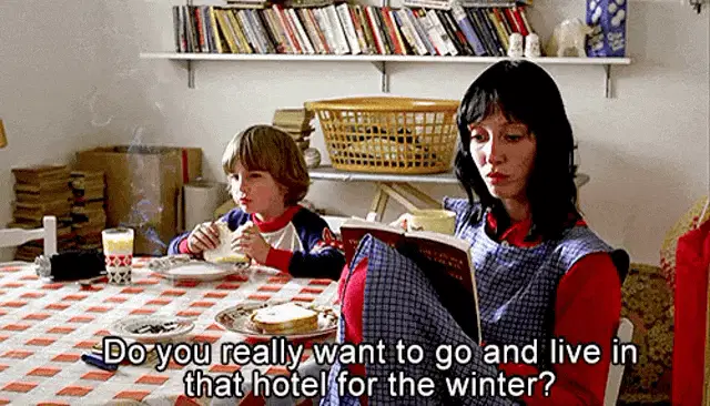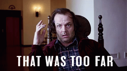 Jack Nicholson from The Shining reacts with 'That Was Too Far' while sitting in a chair.