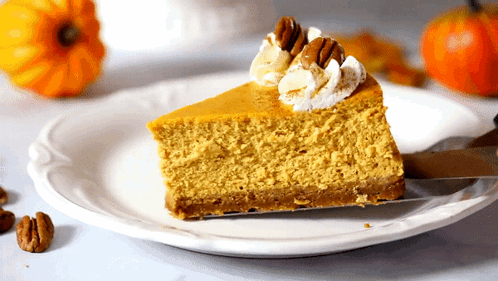 A delectable slice of pumpkin cheesecake, topped with whipped cream and pecans, served on a white plate.
