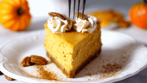 A fork takes a bite out of a delicious slice of pumpkin cheesecake, garnished with whipped cream and pecans.