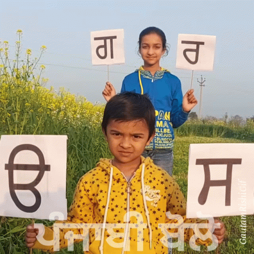 Two children proudly display Punjabi letters in a field, promoting the Punjabi language and culture.