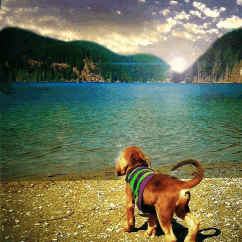 An adorable puppy enjoys a scenic vacation by a tranquil lake with mountains in the background.