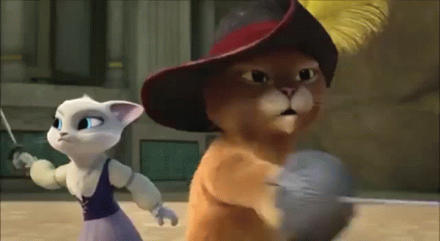 Puss In Boots and Dulcinea engage in a fencing practice, with Dulcinea showing her skill.