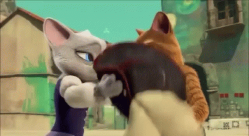 Puss in Boots and Dulcinea share a tender moment, with Dulcinea adjusting Puss's hat and holding his hand.