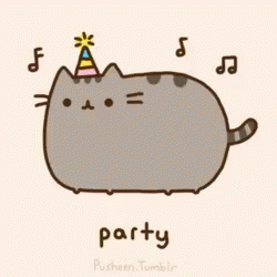 Pusheen Cat wearing a party hat, dancing to music in a fun, animated scene.