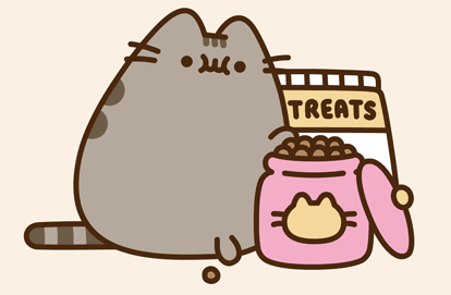Pusheen the cat happily sitting with a box of treats and a jar full of delicious snacks.