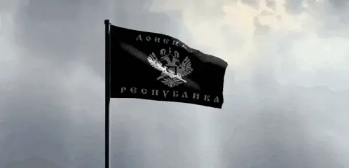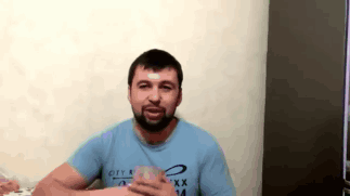 Denis Pushilin, a man with a beard, shows off a stack of money while wearing a blue shirt.