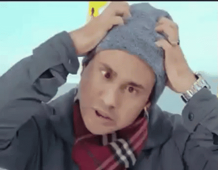 A man wearing a grey beanie and a red plaid scarf looks dizzy or confused, scratching his head.