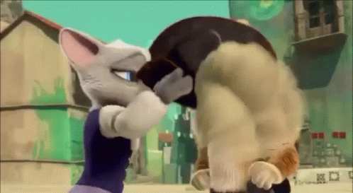 Puss In Boots and Dulcinea share a sweet, affectionate moment, looking into each other's eyes.