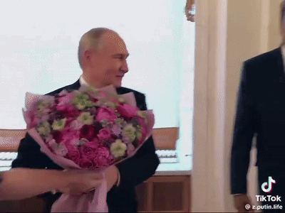 Vladimir Putin presents a bouquet of pink flowers to Cilia Adela Flores de Maduro, with Nicolás Maduro present.