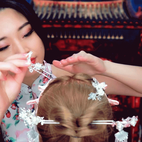 Tingting ASMR demonstrates royal Chinese hairstyling, carefully placing a decorative hair clip.