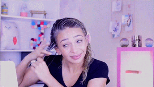 Junia Gabriela demonstrates hair care, pulling and brushing her wet hair in a black shirt.