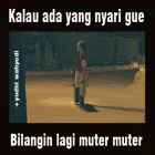 A person spinning around, with an Indonesian caption saying 'If someone is looking for me, tell them I'm spinning around.'