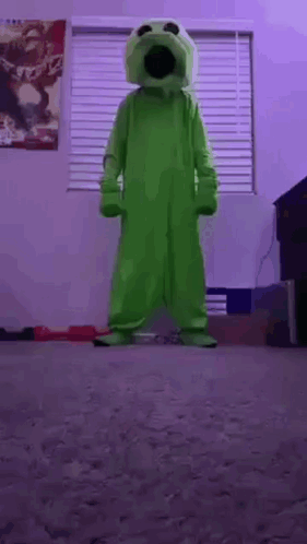 Person in a green Plants vs Zombies Peashooter costume dancing and falling in a room with purple lighting.