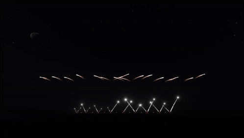 A stunning display of synchronized ground fireworks illuminates the night sky with intricate patterns.