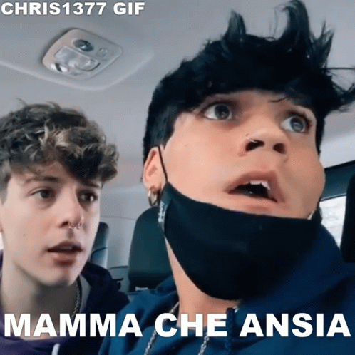 Gianmarco Rottaro and Tancredi Galli in a car, with one wearing a black mask, featuring the caption 'Mamma che ansia'.