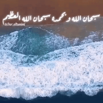 Beautiful ocean waves from Qatar with overlaid Arabic calligraphy praising Allah.