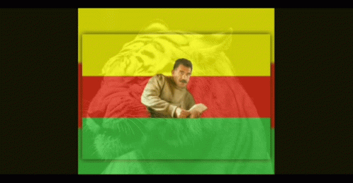 Abdullah Öcalan, the Kurdish leader, shown with a tiger and the Kurdistan flag.