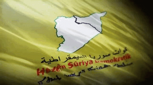 A yellow flag of the Syrian Democratic Forces (SDF) featuring a map of Syria and text in Arabic, Kurdish, and Syriac.