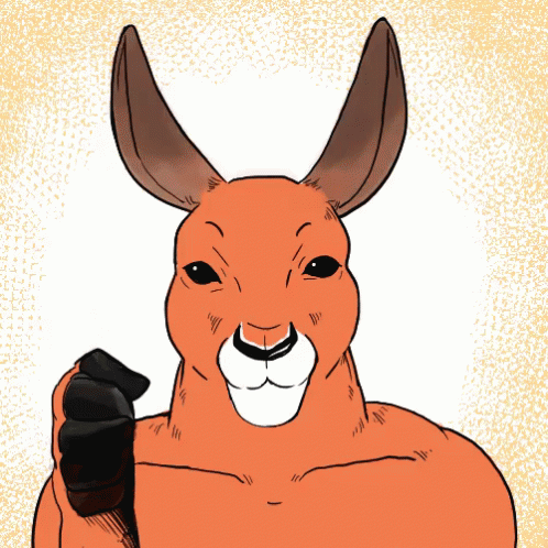 A cartoon kangaroo with a muscular build and a black fist gives a thumbs up, with the Spanish phrase 'Que Agradable!'.