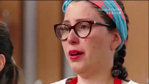 A MasterChef Brazil contestant, wearing glasses and a blue headband, cries with emotion, expressing 'Que Alívio'.