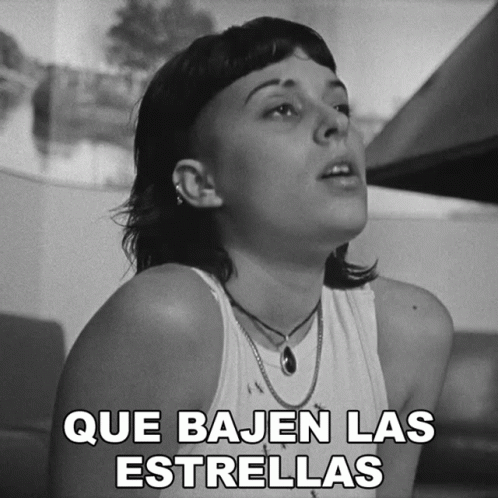 Dora in a black and white image with the Spanish phrase 'Que Bajen Las Estrellas' (Let the Stars Come Down).