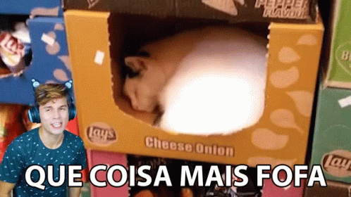 Ronaldo (O Gato Galactico) reacts to an adorable cat curled up and sleeping inside a Lays chip box.