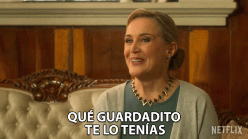 A woman from La Casa De Las Flores exclaims 'What a secret you were keeping!' with a wide smile.
