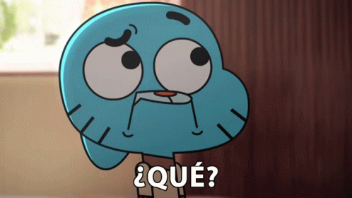 Gumball from The Amazing World of Gumball looks shocked and confused, asking 'What?' in Spanish.