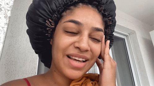 Joicy Eleiny laughs and makes an 'okay' gesture, exclaiming 'Que Loucura!' while wearing a black satin bonnet and braces.
