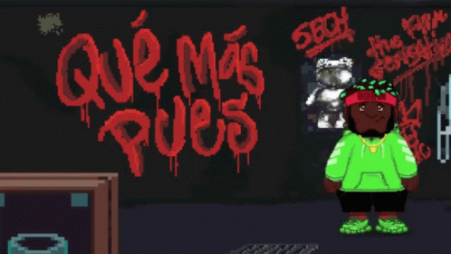 Pixel art animation of a character in a green hoodie walking in front of 'Qué Más Pues' graffiti, featuring Sech.