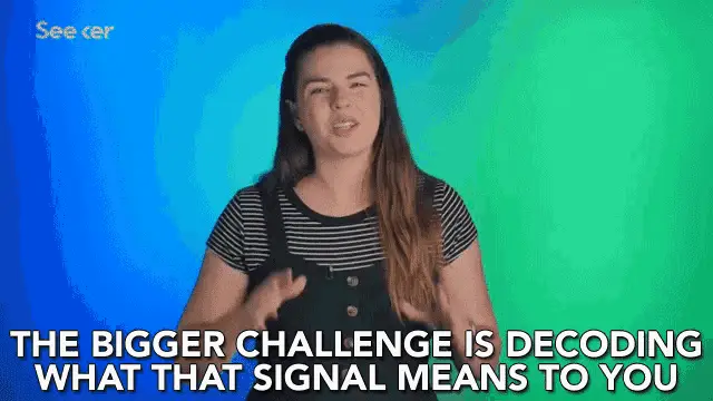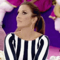 A woman in a black and white striped shirt reacts with shock and disbelief, covering her mouth with her hand.