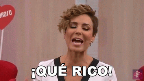 Carmen Munoz exclaims '¡Qué Rico!' on a TV show, with a bright smile and short, styled hair.