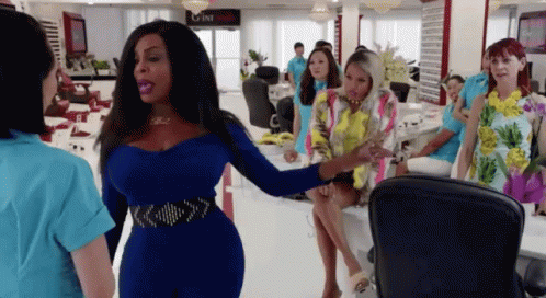 Desna Simms, from Claws, in a blue dress reacts with 'Que Ridículo' (How Ridiculous) in a salon scene.