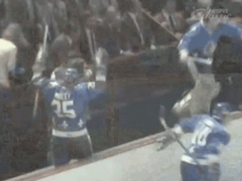 Quebec Nordiques player #15 celebrates an overtime goal on the ice, surrounded by teammates.