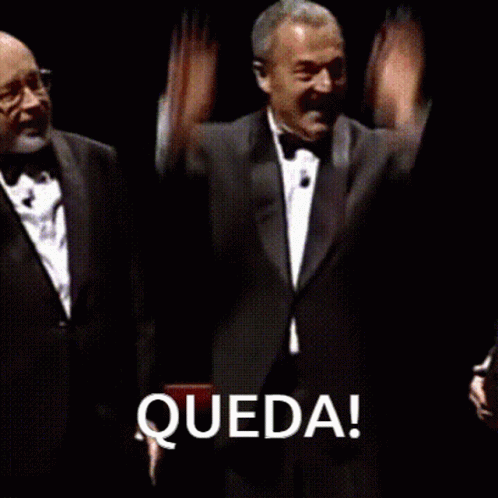 Les Luthiers on stage, one member raises hands as 'Queda!' appears, then looks down.
