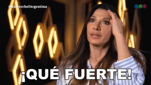 Catherine Fulop reacts with '¡Qué Fuerte!' during Masterchef Argentina, touching her head in surprise.