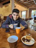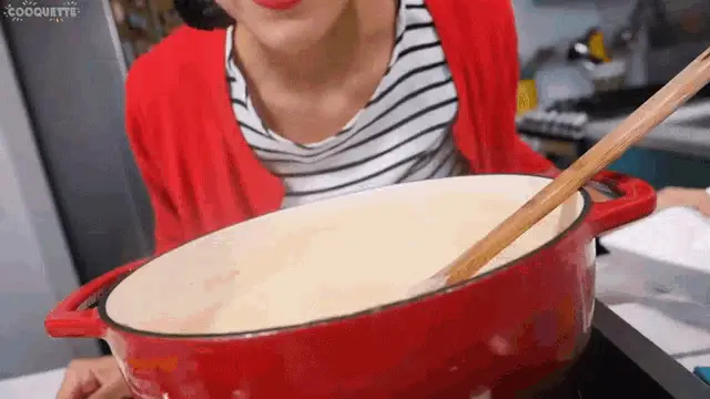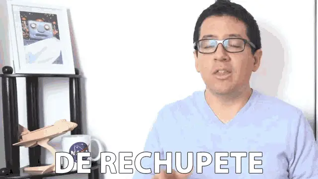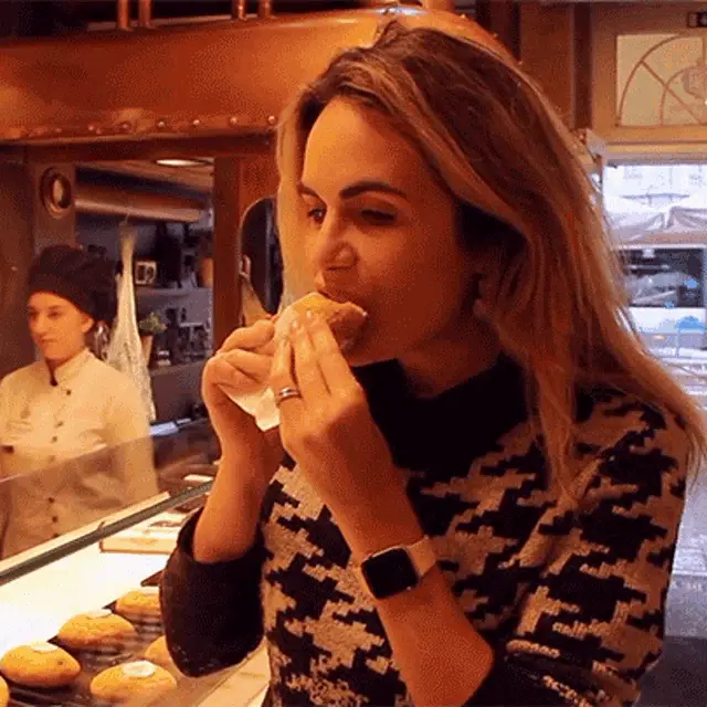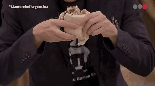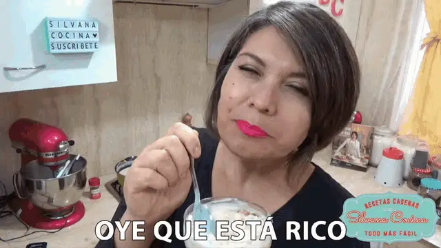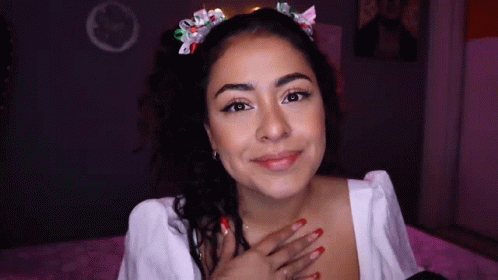 Merith Aranda reacts with '¡Qué Rico!' while smiling and touching her hair, wearing a festive headband.