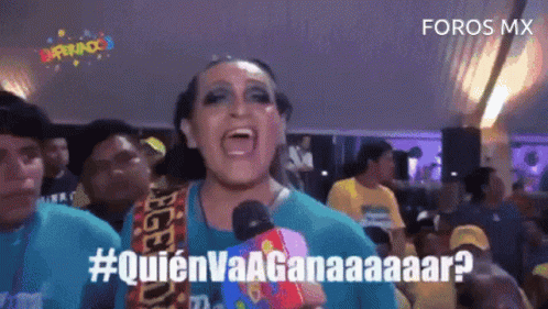 A woman with a microphone enthusiastically asks 'Quién Va A Ganar?' at Feria Tabasco, engaging the crowd.