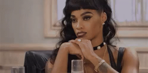 A woman makes a quiet gesture, sitting at a table with her hands on her chin and a glass in front of her.