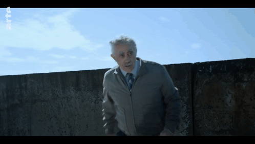 a man in a grey jacket and tie stands in front of a concrete wall with a blue sky behind him
