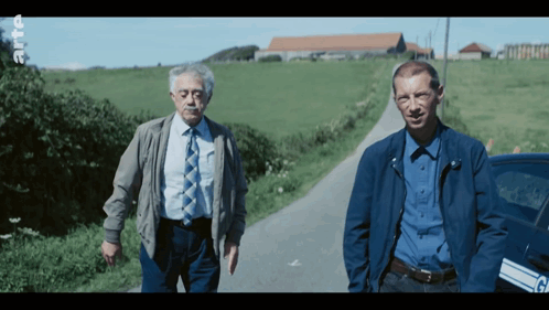 two men standing next to each other on a road with the letter g on the side of the car