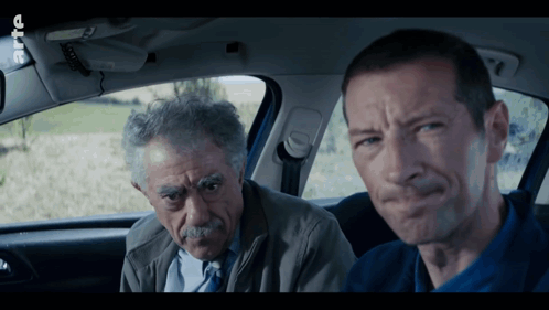two men are sitting in a car with the letters rtl on the screen