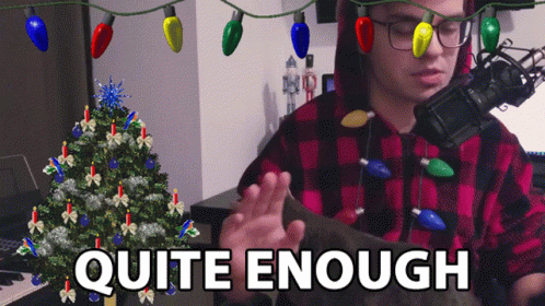 David, adorned with Christmas lights, holds a cat in front of a decorated Christmas tree, with the text 'Quite Enough'.
