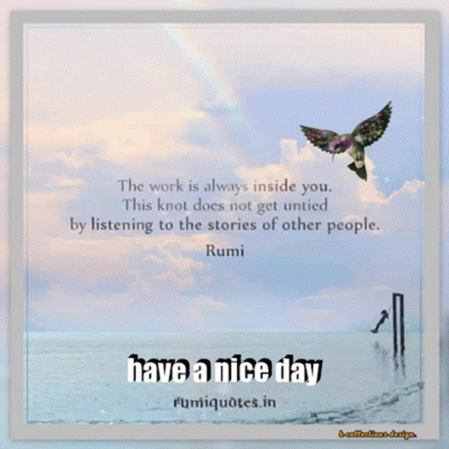 An inspirational Rumi quote about inner work and self-discovery, set against a serene sky and ocean backdrop.