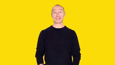 QVC Italia presenter Marco Granati smiles happily at the camera against a bright yellow background.