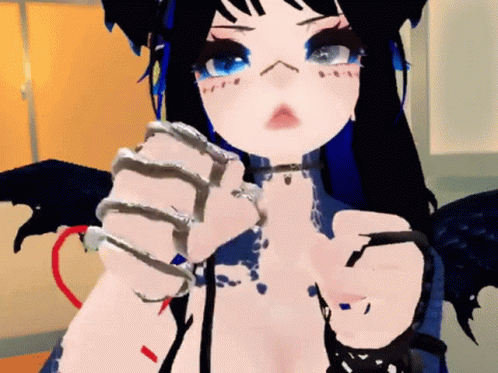 Qynoa, a VRchat character with black hair and blue eyes, wearing a choker and gloves, looks at the camera.