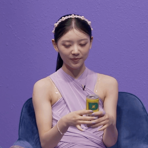 Moka from R U Next claps while holding a yellow can with a green 'P' on it, wearing a pearl headband and purple dress.